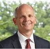 A bald man wearing a dark suit, white shirt, and red tie smiling outdoors with green trees in the background.